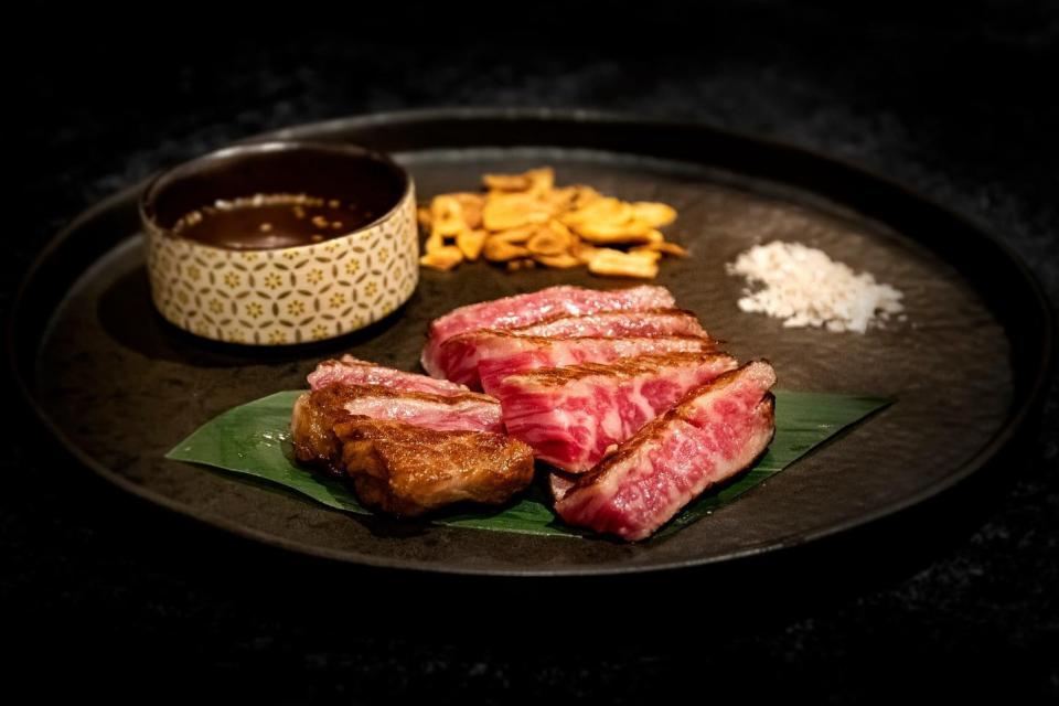 Para empezar, un Gunkan de Wagyu —tartar de Wagyu, arroz de sushi y yema de huevo de codorniz— o bien Tataki de Wagyu —top sirloin sellado, rábano, elote, cebollín, bubu arare, salsa ponzu con yuu kosho y aceite de ajonjolí.